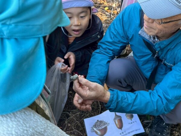 公園には、どんぐりのなる木がたくさんあり、どんぐりの実を探しながら、葉、樹皮の違いなどを楽しみました。江連先生から、シラカシ、コナラ、クヌギといった3種類のどんぐりの名前を教えてもらい、持ってきた袋に入れていました。栗も落ちていて、イガイガに気を付けながら拾っていました。落ち葉の中を歩くと、「足がもぐって何だか歩きにくい!」と話しながらも、その感触を楽しんでいるようでした。あっという間の1時間30分でした。