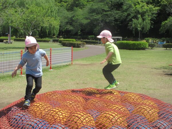 そして、緑いっぱいの公園内をお散歩した後は、いろいろな遊具で体を使って遊びました。