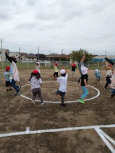 久しぶりのお散歩なので、子どもたちはうれしそう…。でも、車に十分気を付けなければいけません。大きい子が小さい子の面倒を見ながら歩きました。
