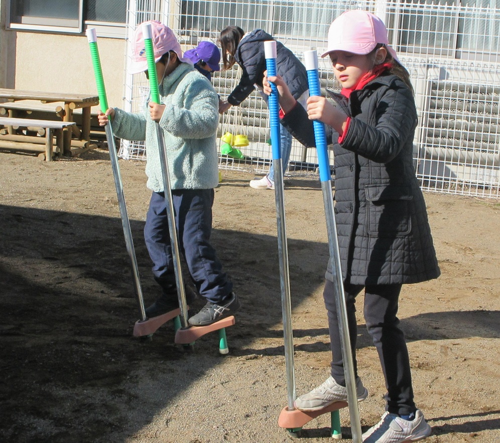 午前中、寒かったけれど、お外で竹馬や大縄跳びをして遊びました。どちらもなかなか難しいのですが、みんなチャレンジしていました。
