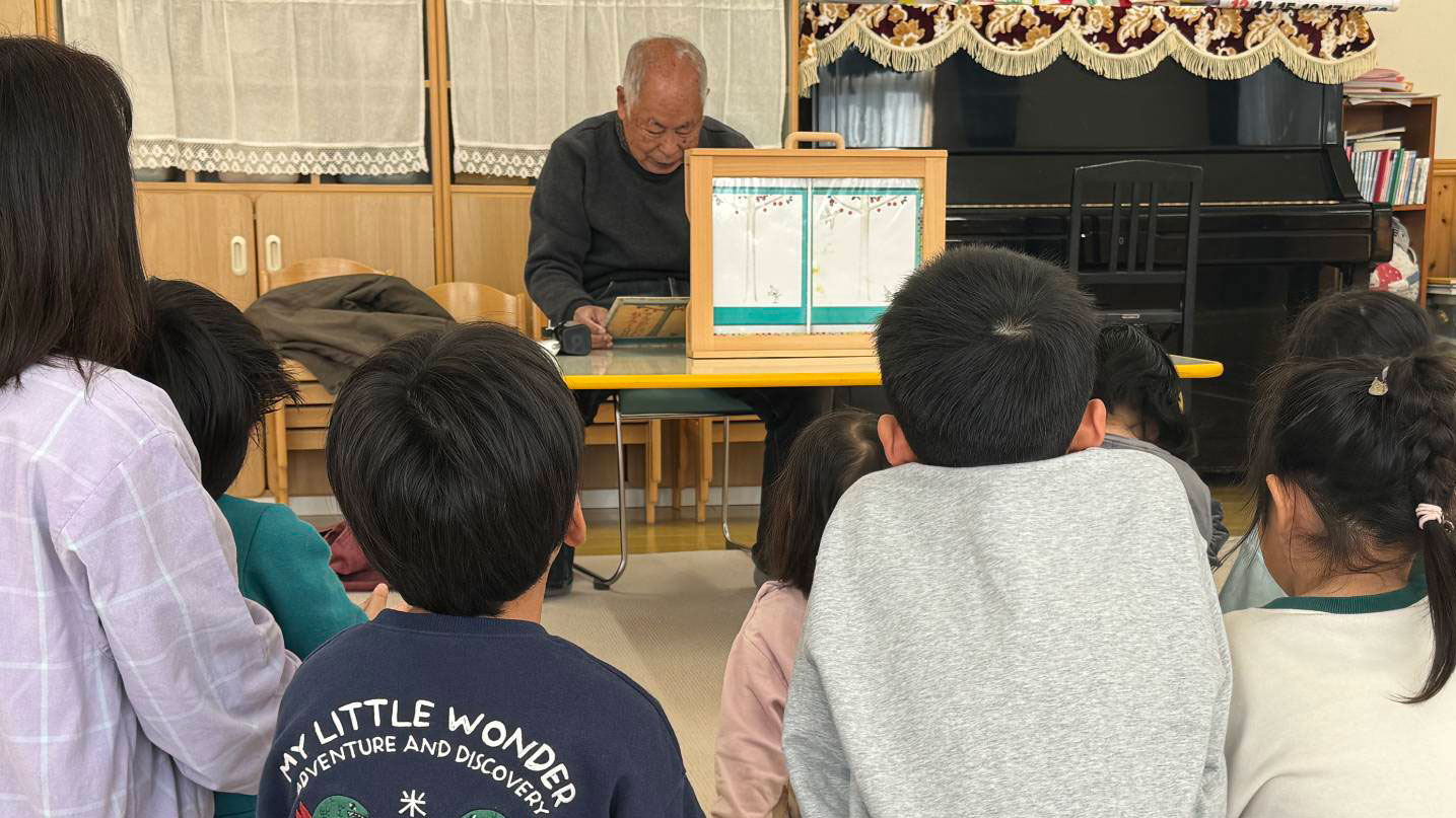 人生経験豊かで、老健施設で書道や歌を教えている吉光寺先生。子どもたちは、昔ながらの紙芝居が大好きで、長いお話も静かに集中して聞いています。