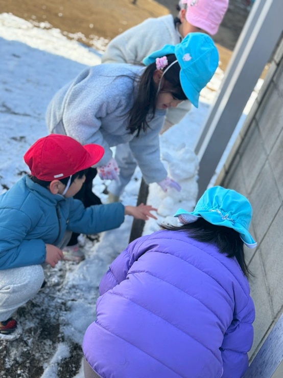 昨日降った雪が園庭に積もっていたので、今日は雪遊びをしました。「どろどろになるから、雪合戦はやめようね!」先生の言いつけを守って、子どもたちは雪だるま作りに励みました。ふわふわで綿菓子のような雪でした。お外は空気が冷たくてとても寒かったけれど、小さなかわいい雪だるまが出来上がりました。リトミックの前の短い時間でしたが、久しぶりの雪に子どもたちは満足している様子でした。